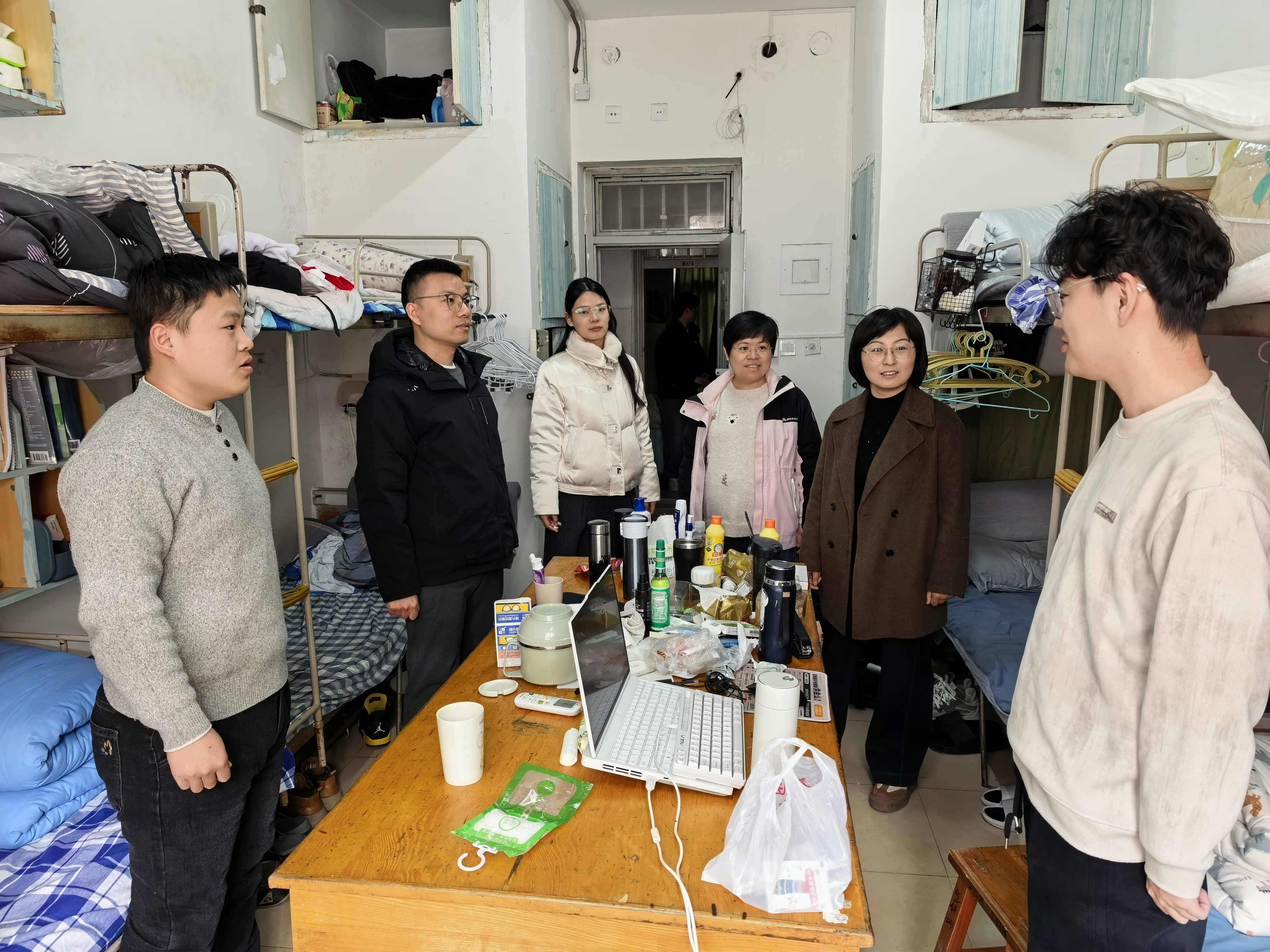 走访过程中,刘凝与辅导员们逐一走进学生宿舍,仔细查看宿舍安全、卫生等情况,重点排查宿舍内违规电器使用、私拉乱接电线、消防通道堵塞等各类安全隐患;及时了解关注同学们在思想动态、学业压力、毕业就业等方面存在的困惑与需求,鼓励大家尽快从“假期模式”切换到“学习模式”,共同营造安全、卫生的宿舍环境。